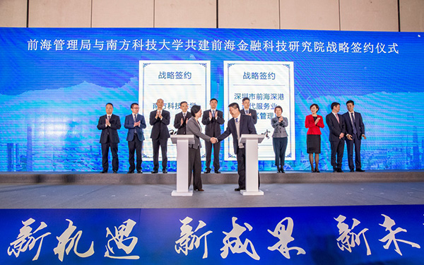 12月7日,“新機(jī)遇•新成果•新未來——2019前海成果發(fā)布會(huì)”在前海深港合作區(qū)舉行。發(fā)布會(huì)上,前海管理局局長(zhǎng)助理、前海地方金融監(jiān)管局常務(wù)副局長(zhǎng)文娉與南方科技大學(xué)校長(zhǎng)辦公會(huì)成員王鵬飛代表雙方簽署了“前海管理局與南方科技大學(xué)共建前海金融科技研究院”的戰(zhàn)略合作協(xié)議。深圳市委常委、前海蛇口自貿(mào)片區(qū)管委會(huì)主任、前海管理局局長(zhǎng)田夫等領(lǐng)導(dǎo)見證簽約。