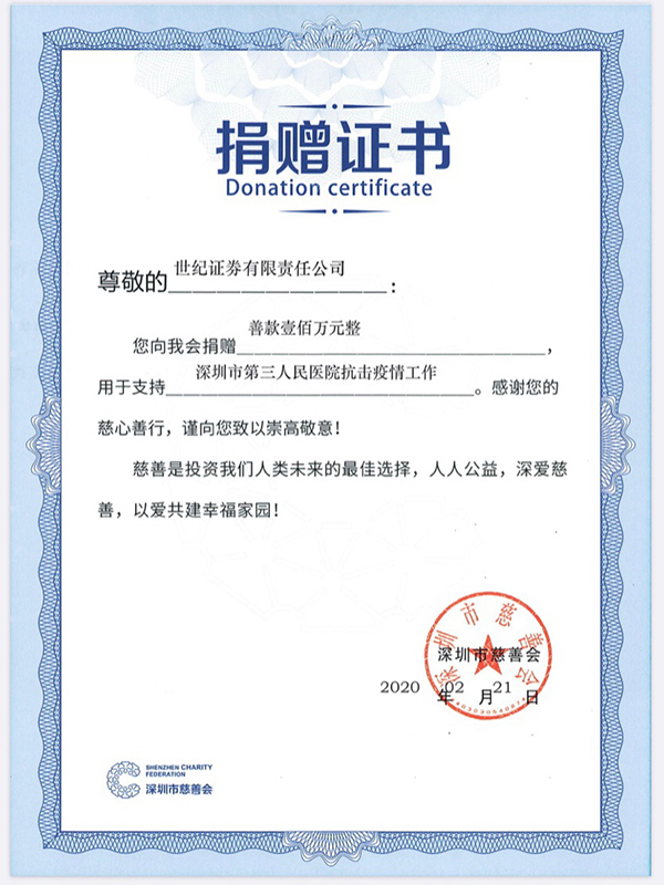 據了解,疫情發生后,世紀證券認真貫徹落實黨中央、國務院、證監會的決策部署,始終將員工和客戶安全放在首要位置,將疫情防控作為當前工作的重中之重。同時,世紀證券踐行初心使命,主動履行企業社會責任,在了解到深圳市第三人民醫院作為深圳市新冠病毒感染肺炎確診患者的集中收治醫院的情況后,向深圳市慈善會捐贈100萬元,定向用于該院的疫情抗擊工作。除了此次定向捐贈,此前世紀證券全體員工還借助互聯網公益平臺參與肺炎疫情防控專項募捐,在短短3天時間內便募集金額 9.7萬元,所籌款項均實時直達湖北省慈善總會“緊急救援新冠肺炎”專項募捐項目。