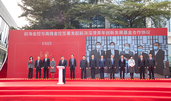 為貫徹落實《粵港澳大灣區(qū)發(fā)展規(guī)劃綱要》關(guān)于支持港澳青年在內(nèi)地發(fā)展的部署要求,發(fā)揮前海聯(lián)通兩個市場、對接兩種制度、暢通國內(nèi)國際雙循環(huán)的重要優(yōu)勢,推動香港青年在前海聚集發(fā)展,促進香港更好融入國家發(fā)展大局,12月7日,前海金融控股有限公司與高鋒金融控股有限公司在前海青年夢工場簽署發(fā)起前海深港青年創(chuàng)新發(fā)展基金合作協(xié)議。前海金控董事長孟曉和高鋒金控行政總裁黃俊瑯(線上)出席儀式并簽約,香港中聯(lián)辦青年工作部副部長張志華視頻致辭。