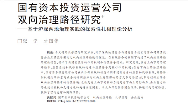 近期,前海金控博士后創新實踐基地博士后張寧與中山大學嶺南學院才國偉教授在中國社會科學院評定的管理學唯一頂級期刊《管理世界》2021年第1期合作發表論文,這標志著我司博士后的學術研究水平邁上新臺階。《國有資本投資運營公司雙向治理路徑研究——基于滬深兩地治理實踐的探索性扎根理論分析》一文為深化國資國企改革、暢通雙向治理路徑提供了理論支撐和實踐經驗參考。