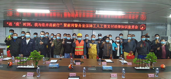 近日,前海金融控股大廈項目(以下簡稱項目)組織召開“戰‘疫’時刻,我與您并肩前行”暨前灣警務室保障工人工資支付法律知識宣貫會,旨在加強春節期間項目各參建單位管理人員和勞務人員的防疫意識,鞏固項目勞資維穩的工作成果。